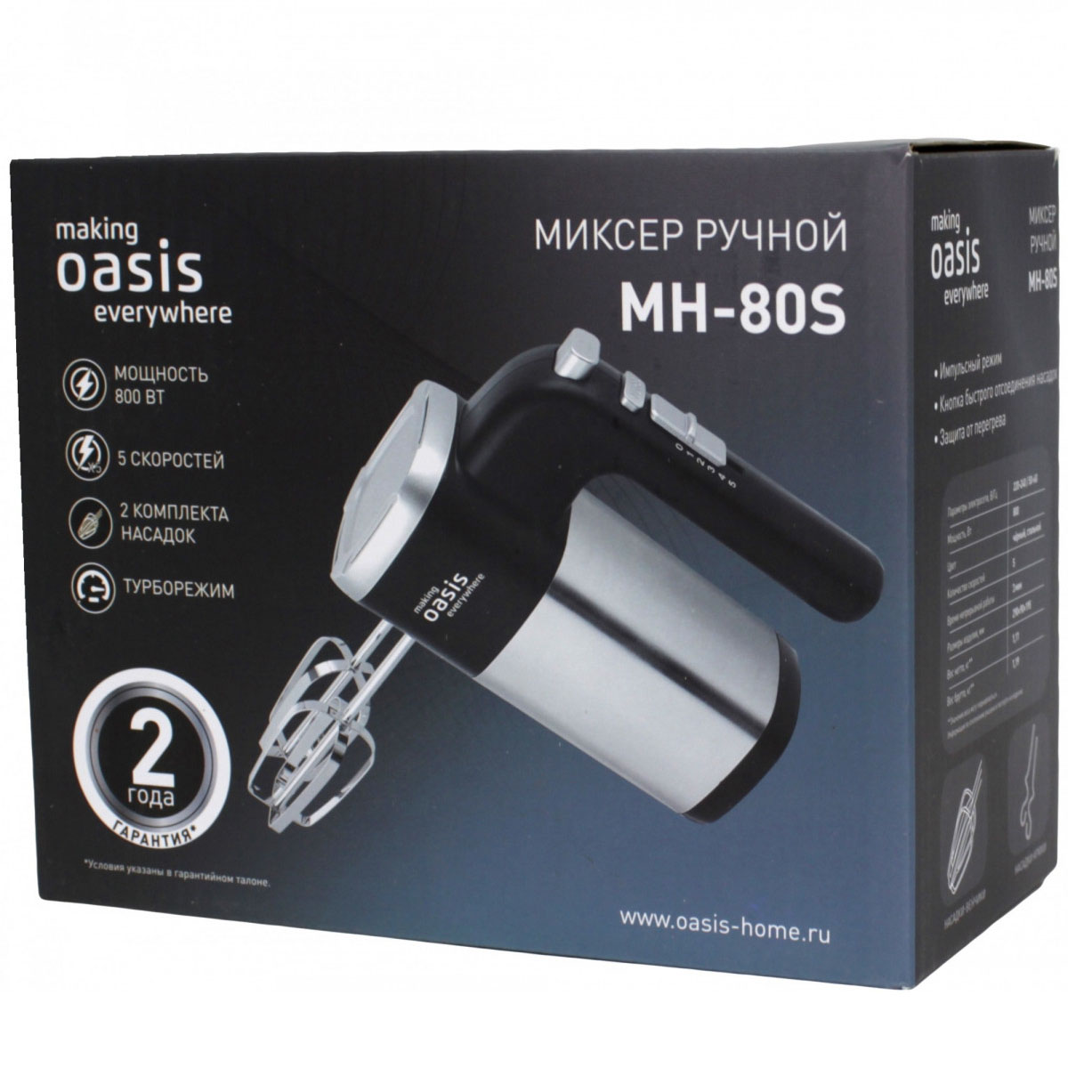 Ручной миксер making Oasis everywhere MH-80S – компактный, но высокопроизводительный кухонный прибор. За считанные минуты устройство превращает сливки в пышную пену, доводит яичные белки до устойчивых пиков и замешивает негустое тесто для блинчиков или кляра. Кроме того, можно готовить молочные коктейли или домашние соусы.Технические характеристики: