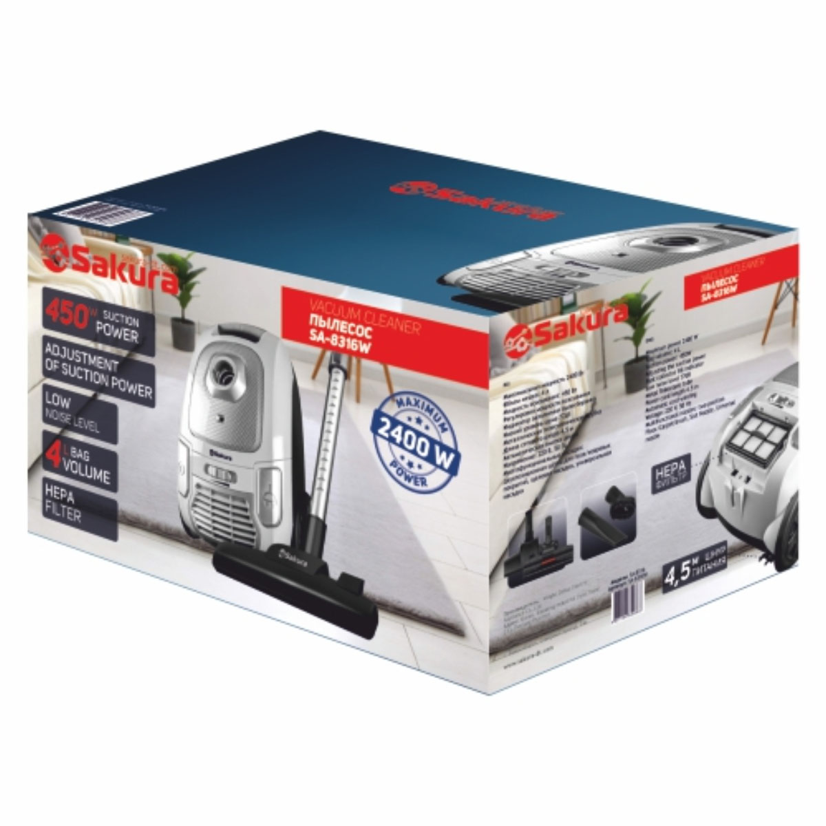 Пылесос эл. SAKURA SA-8316W, 2400Вт,мешок,НЕРА,регул/мощн, белый/черный