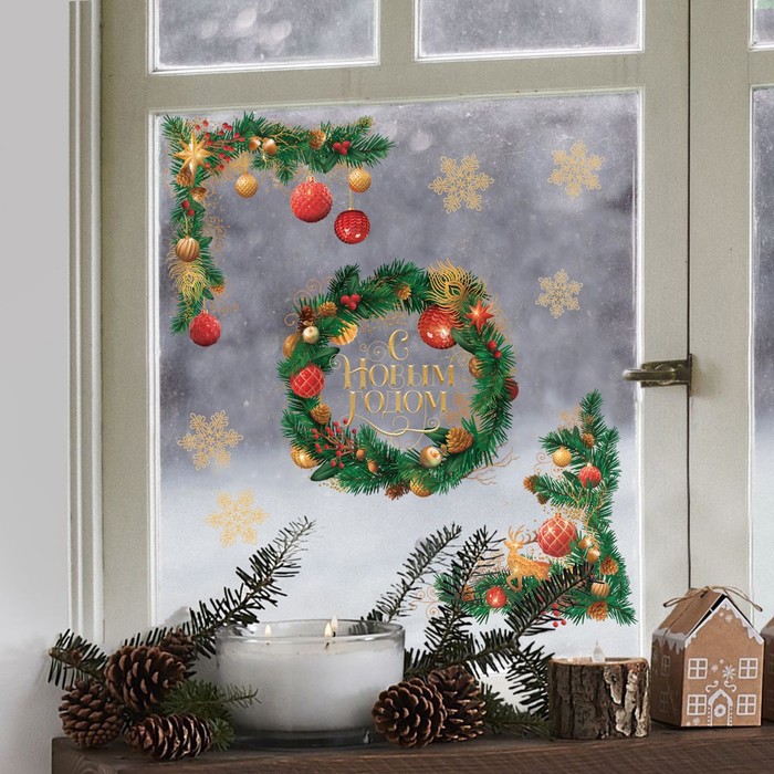 Наклейка на стекло 7819081 Новогодний венок 70*25см