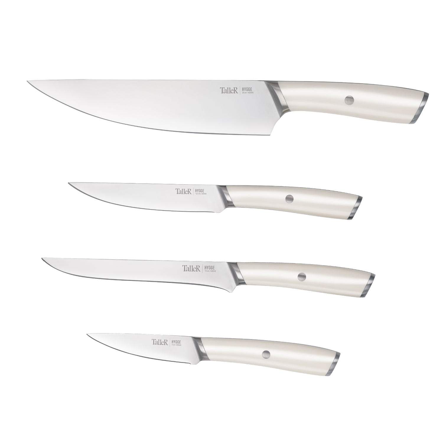 Набор ножей TalleR TR-22015 "Хюгге» — компактный и функциональный комплект из 4 ножей с подставкой из каучукового дерева. Лезвия выполнены из прочной коррозионностойкой стали AISI 420S45 (3Cr13), что обеспечивает долгий срок службы и устойчивость к притуплению. Рукоятки из ударопрочного пластика гарантируют удобный и надежный хват, а сбалансированность ножей делает их использование максимально комфортным.