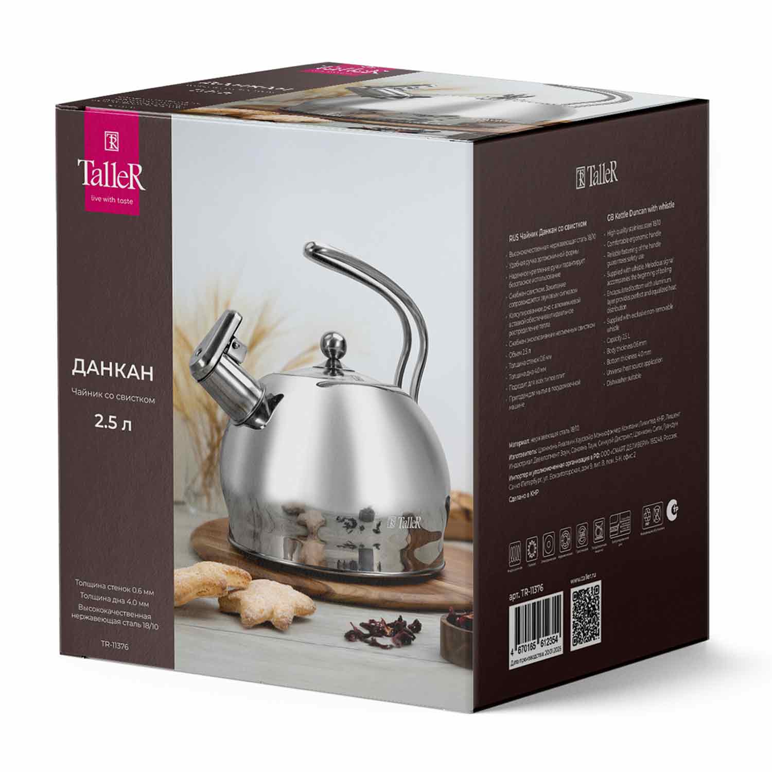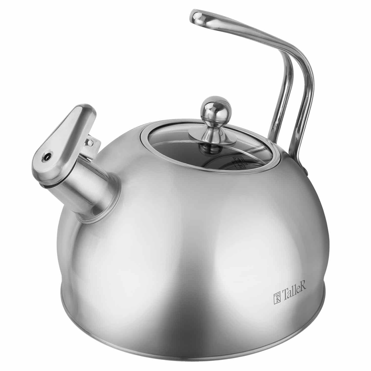 Чайник TalleR TR-11376 "Данкан» — стильный и функциональный выбор для вашей кухни. Изготовлен из высококачественной нержавеющей стали 18/10 с зеркальной полировкой, которая придаёт изделию элегантный блеск и облегчает уход. Объём 2,5 литра оптимален для семьи или небольшого коллектива.Толстое дно (4 мм) обеспечивает быстрый и равномерный нагрев воды, а толщина стенок 0,6 мм гарантирует долговечность изделия. Крышка выполнена из прочного стекла и нержавеющей стали, что удобно для контроля за процессом кипячения. Ручки из нержавеющей стали прочные и надёжные.