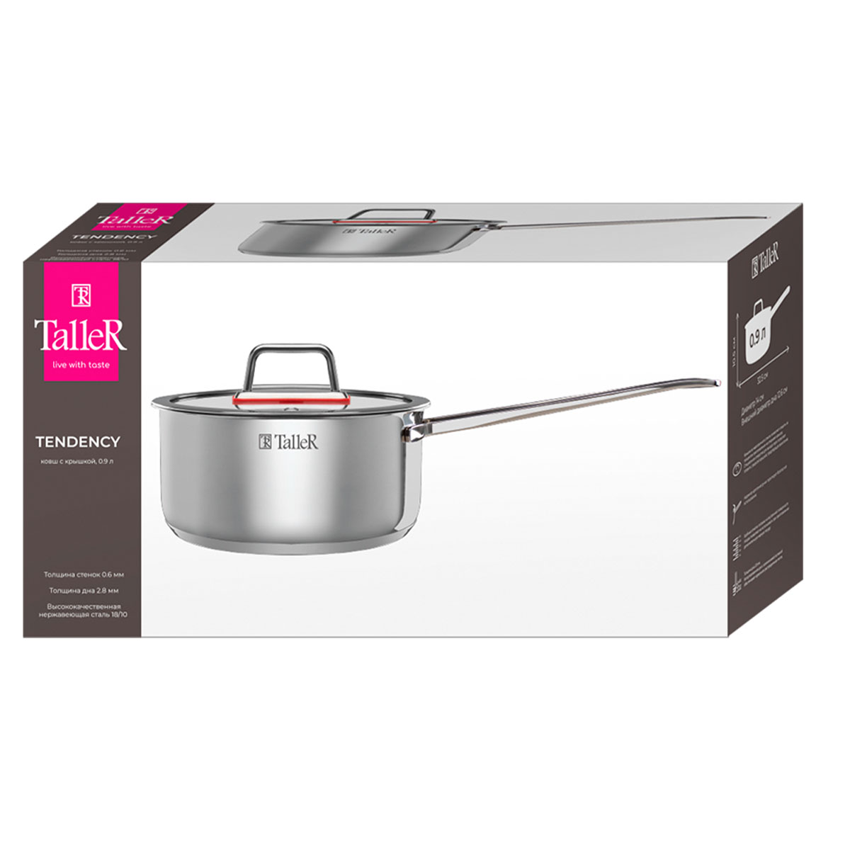 Ковш с крышкой TalleR TR-17271 "Тенденси» объёмом 0,9 л — компактная и функциональная модель из высококачественной нержавеющей стали 18/10 с зеркальной полировкой внутри и снаружи. Капсулированное дно толщиной 2,8 мм обеспечивает равномерное и быстрое распределение тепла, а стенки толщиной 0,6 мм гарантируют надёжность и долговечность.