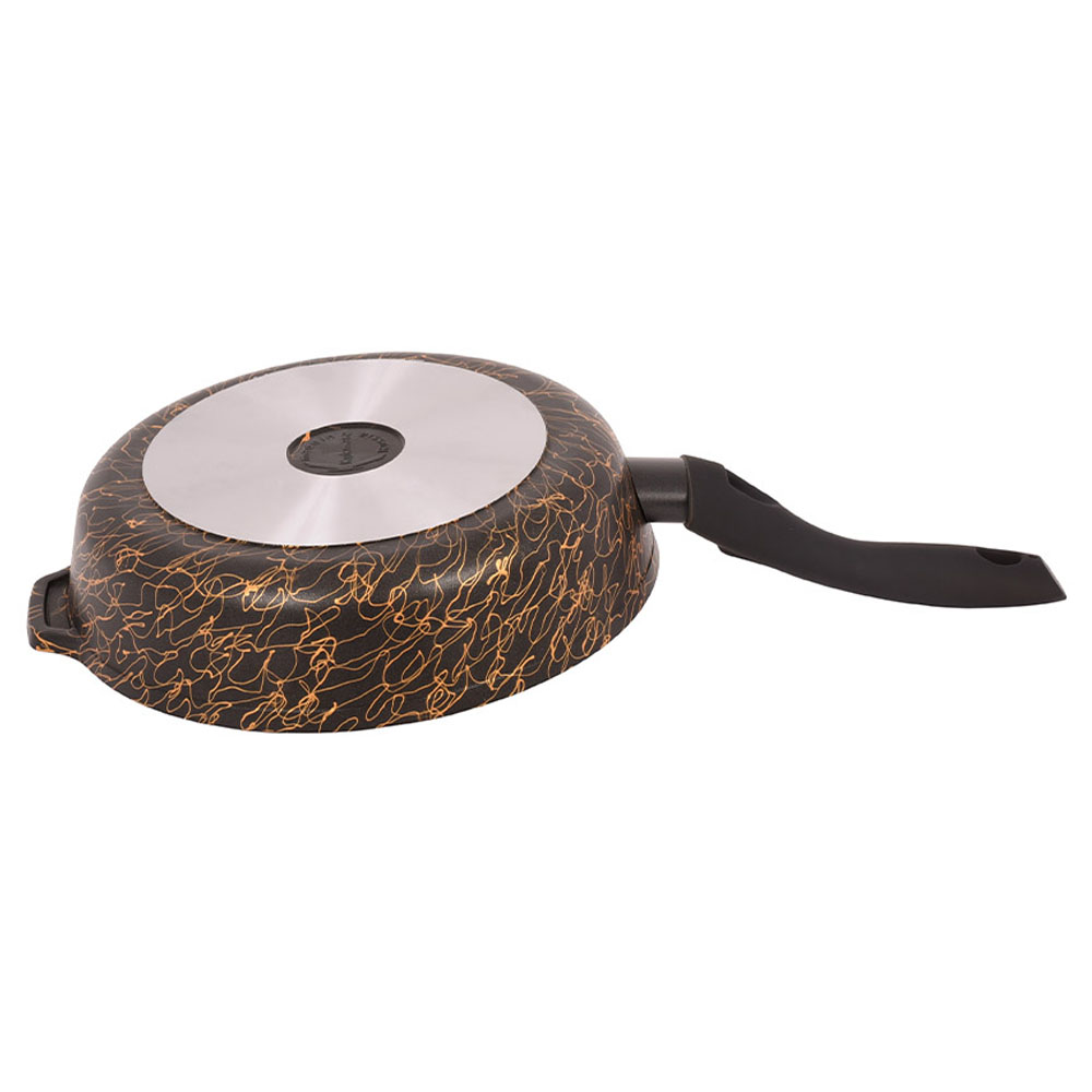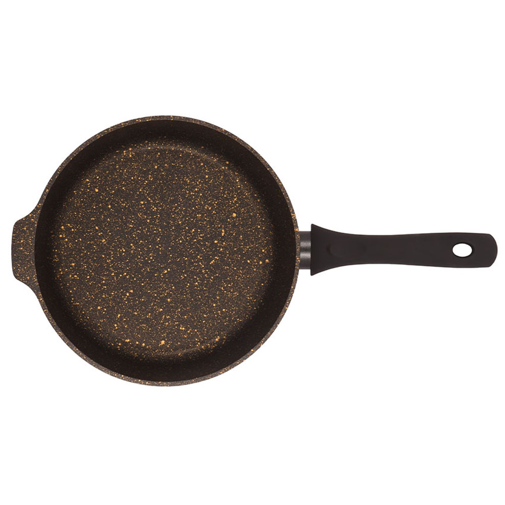 Модель оснащена удобной несъёмной ручкой и эффектным термостойким декором в черно-золотом исполнении. Сковорода подходит для газовых, электрических и стеклокерамических плит, а также допускает мытьё в посудомоечной машине.