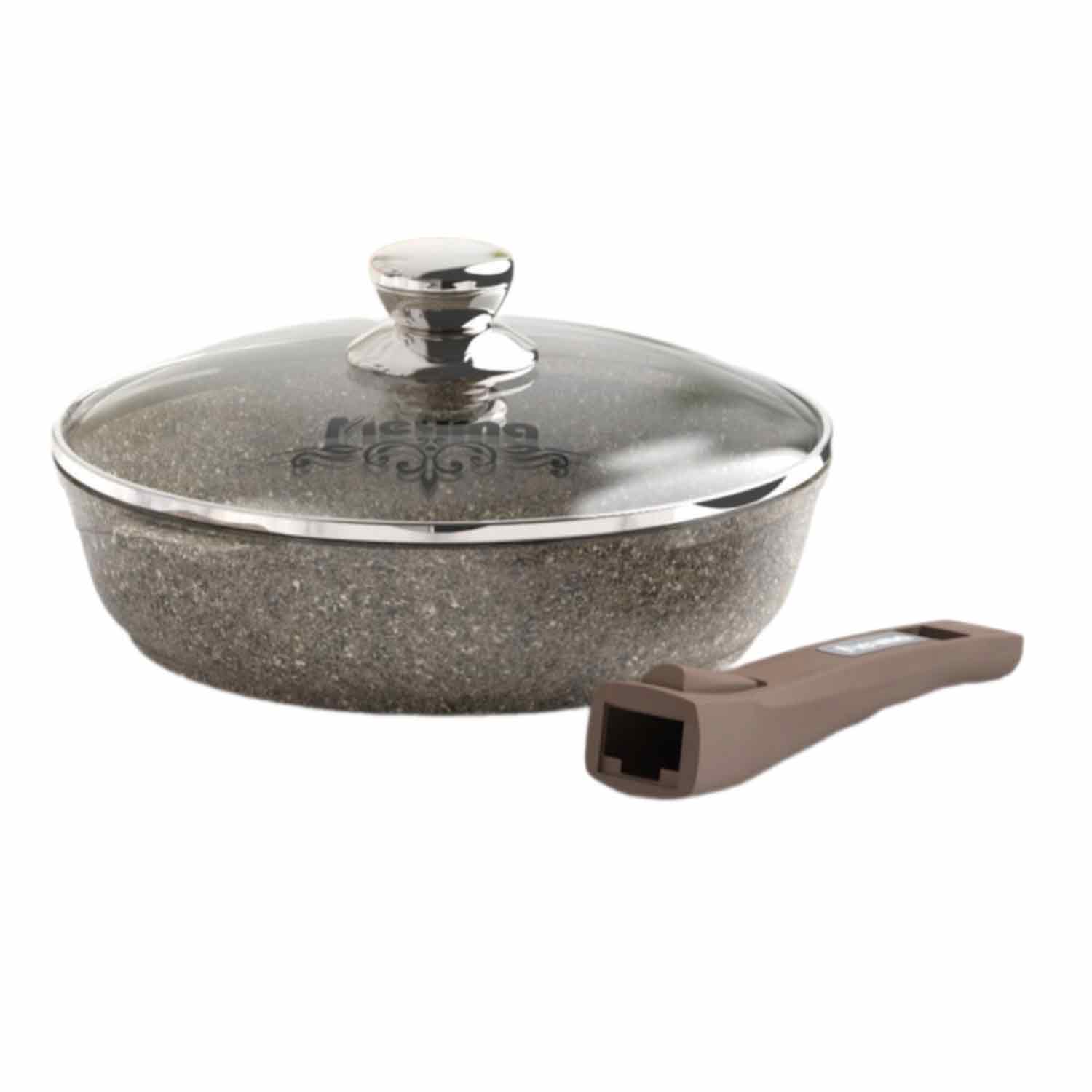 Съёмная ручка позволяет использовать сковороду в духовке, а стеклянная крышка удерживает тепло и аромат, позволяя контролировать процесс готовки. Современный коричневый цвет корпуса и лаконичный дизайн гармонично впишутся в любую кухню. Совместимость с большинством плит делает модель по-настоящему универсальной.