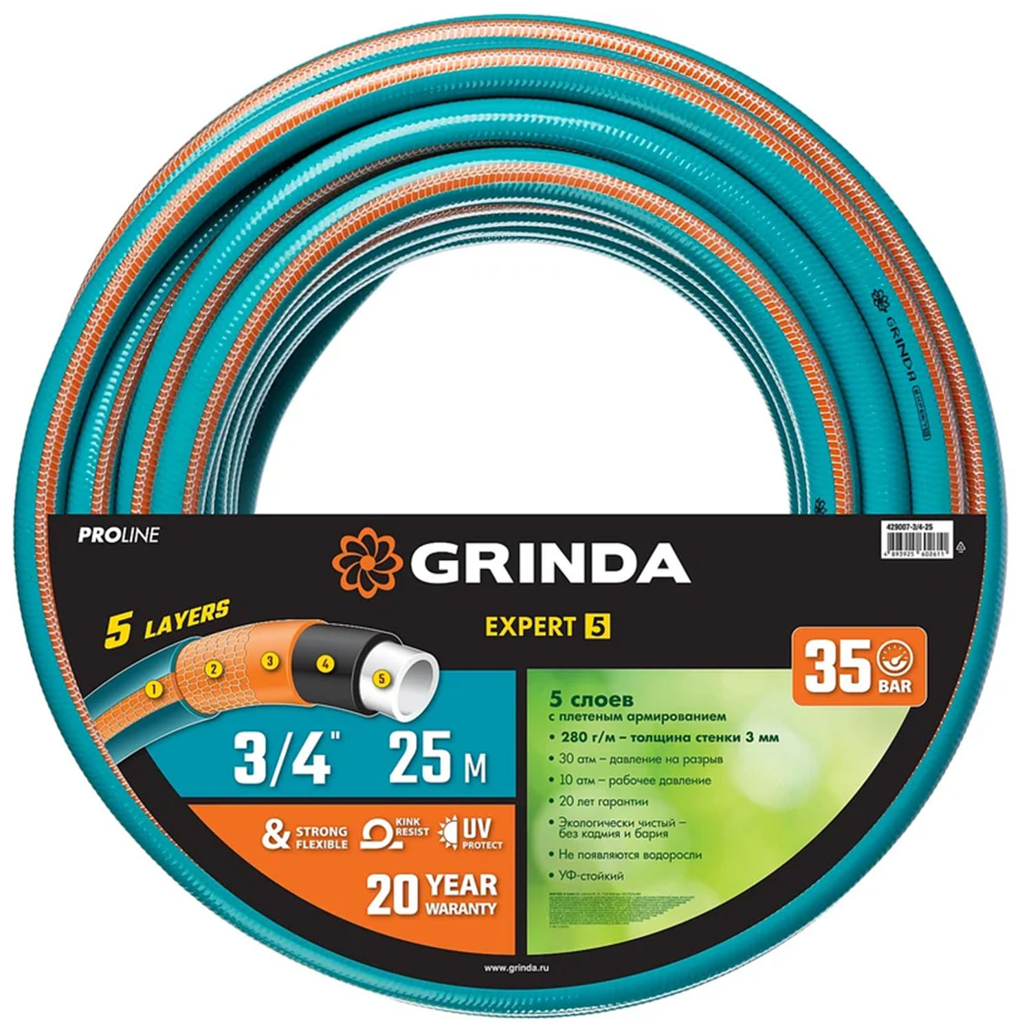-Шланг поливочный GRINDA EXPERT 429007-3/4-25 5, 3/4" 25м, 30 атм, пятисл, текстильн. армир, PROLine